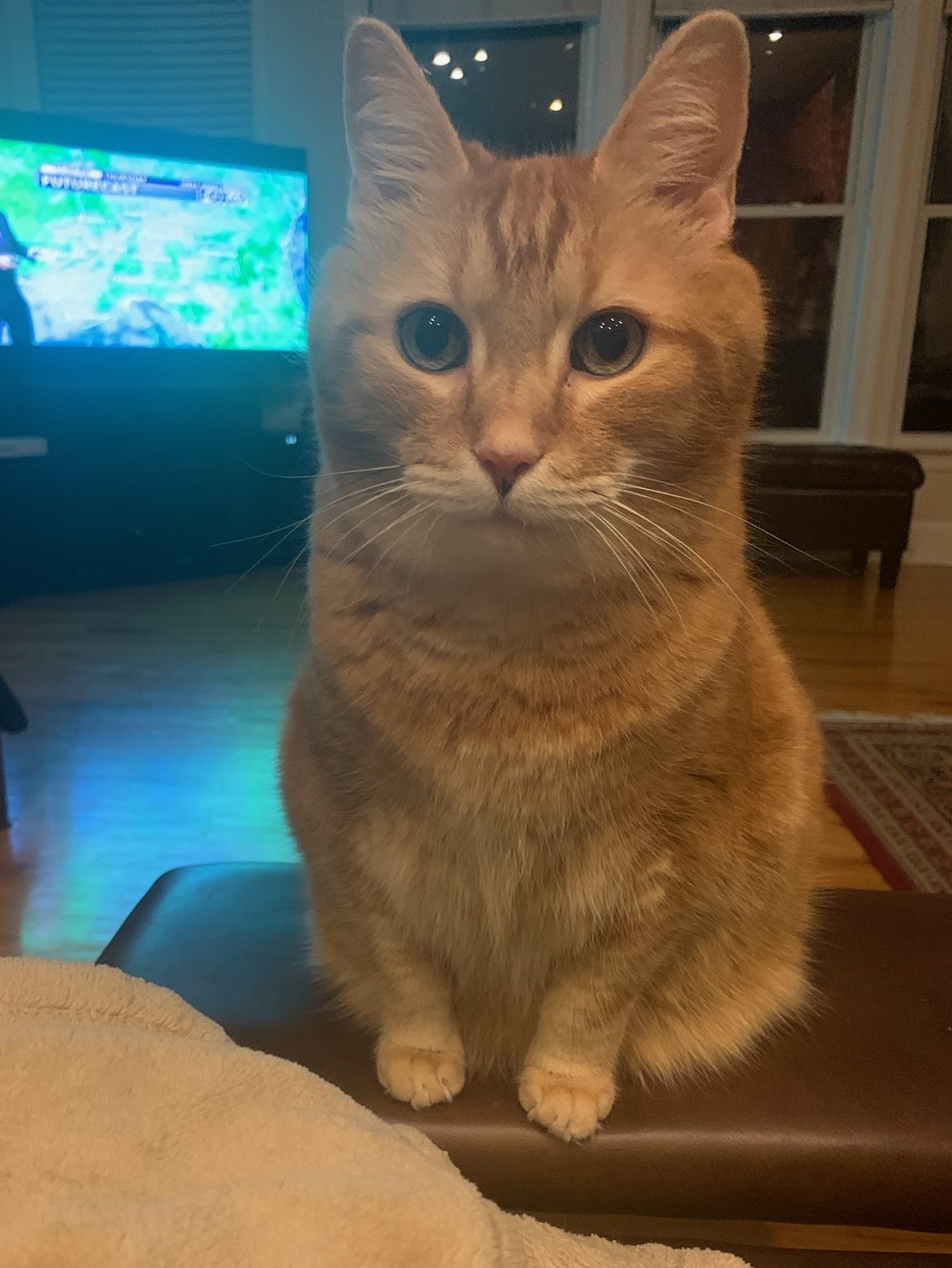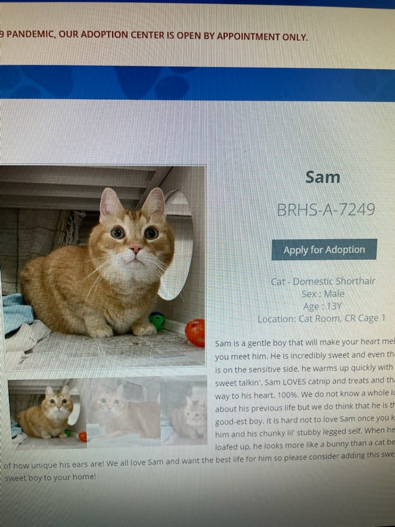 As I continued my search for an old companion, something caught my eye – a picture of a big-eyed, bunny-eared orange cat named Sam. Sam was listed as 13 years old but looked like a little baby, earning him one of his many monikers to come, “baby cat.” As soon as I saw his picture I knew I wanted him. I reached out to the humane society, and they scheduled a meet and greet for the Sams. At our meeting he was brought out in a bright pink flowery carrying case, clearly comfortable with his masculinity. Sam was very shy when I first met him. He did not want to even leave the carrier despite the nice woman goading him to come out. I didn’t care. She asked me if I wanted him and I said yes. I took Sam home in his pink carrier and we spent our first night together.